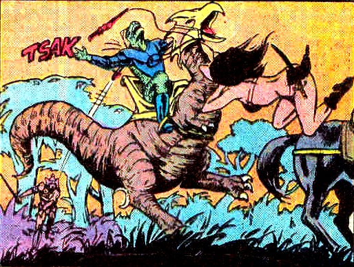 Synopsis: Morgan’s quest to find the sorcery that can save Jennifer continues. He’s also still pondering the possible link between the alchemist he encountered with a penchant for changing women into were-cats and Shakira. (He’s not going to keep pondering this forever, trust me.) He snaps out of contemplation when Shakira returns and tells him there’s a warrior nearby being pursued by burly lizard men on weird mounts.