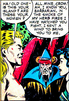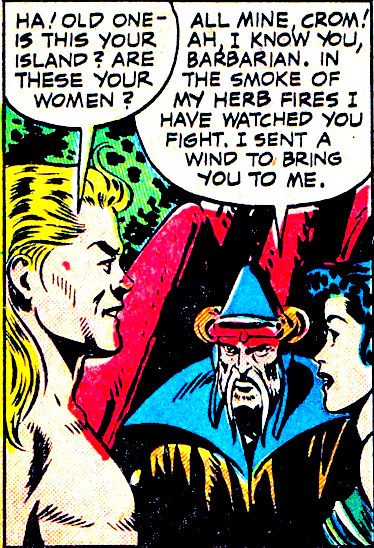 The wizard is named Dwelf, and he’s got a job for Crom. Dwelf wants him to bring back water from the fountain of youth which was built by “people from the stars’ and will one day be lost “under what men will call the Sahara desert.” Dwelf threatens Lalla if Crom doesn’t get the stuff for him--and then hypnotizes him to make double sure.