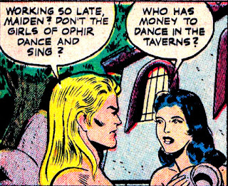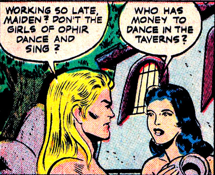 Crom sails to fabled Ophir. He sneaks into the city and while he’s casing the tower that houses the fountain, he meets a girl who doesn’t really get the concept of sword & sorcery tavern-dancing: