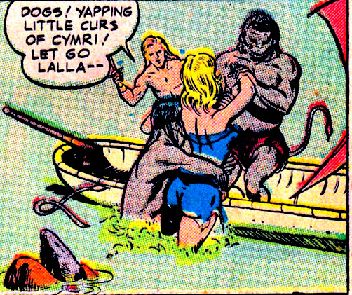 Anyway, Crom’s a yellow-haired Aesir living in an age forgotten by history, and he’s got a problem. His sister Lalla have been kidnapped by ape-men called Cymri (which may or may not tell us how Fox felt about the Welsh). Crom makes short work of the ape-men, but he and Lalla wind up adrift.