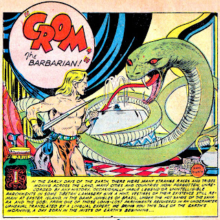 Crom was the creation of Gardner Fox and first appeared in Out of this World #1 (1950) from Avon. Fox tells us that Crom’s adventures come to us courtesy of “long-lost parchments recovered in an underwater upheaval, translated by a lingual expert,” but I suspect he made it all up. He also took a lot of inspiration from Howard's Conan yarns.