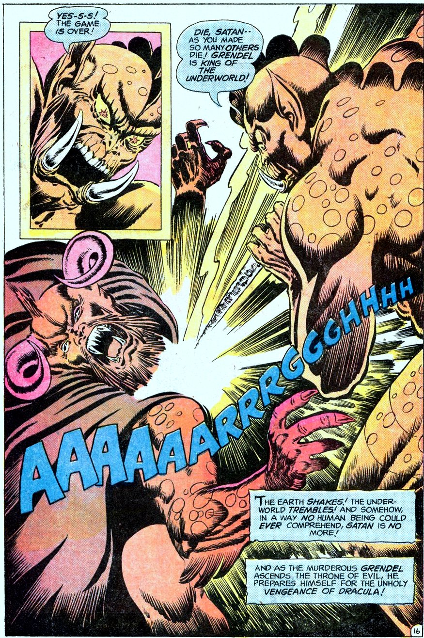 That’s right: Grendel stabs Satan with a stalactite and seizes the throne of Hell because he’s mad his infernal majesty chose Dracula (literally Satan’s son) as heir instead of Grendel.