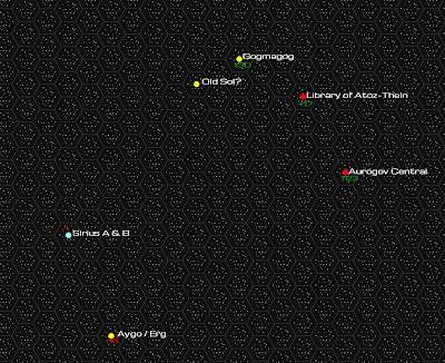 I've been asked before for a map of the Strange Stars. While I don't have a map of that whole area close to ready to share by any means, I was playing around with some hexographing software last night and was able to duplicate relatively quickly the part of the Zuran Expanse I've discussed on the blog. Since I tend to jump around a lot in my posts, even this area is a bit sparse.