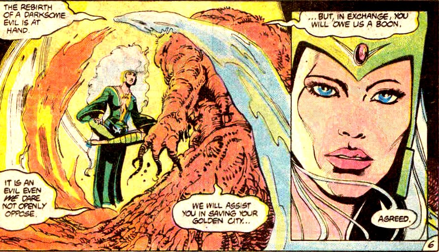 While our heroes fight the fires and advancing lava in Shamballah, the three inhuman sorcerers swarm around a golden, skull-adorned casket—the thing that was inside the crystal egg. Their Mistress has survived the crossing. “Let evil rejoice.”