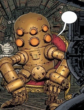 A voice emerges from a grating in its chest, and it asks if the group brought "them." They hand the bag over, and it dumps the contents on the table--tiny, metal pieces. It turns back to the lens and says: "we can renew our game."