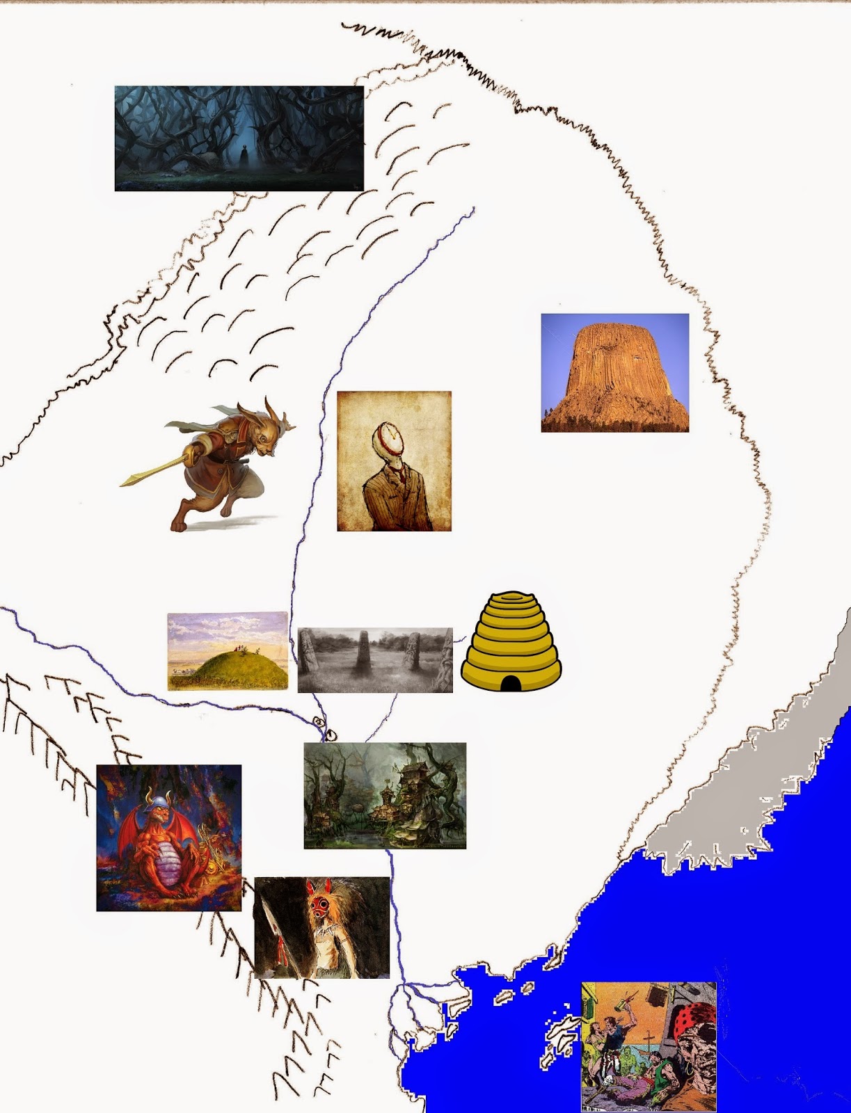 I've been trying to but together a map so I can send notes off to Gus L of the Dungeon of Signs to get a map like this cool ASE one he did. Mainly, I just seem to be adding now locales and not getting much drawing done.