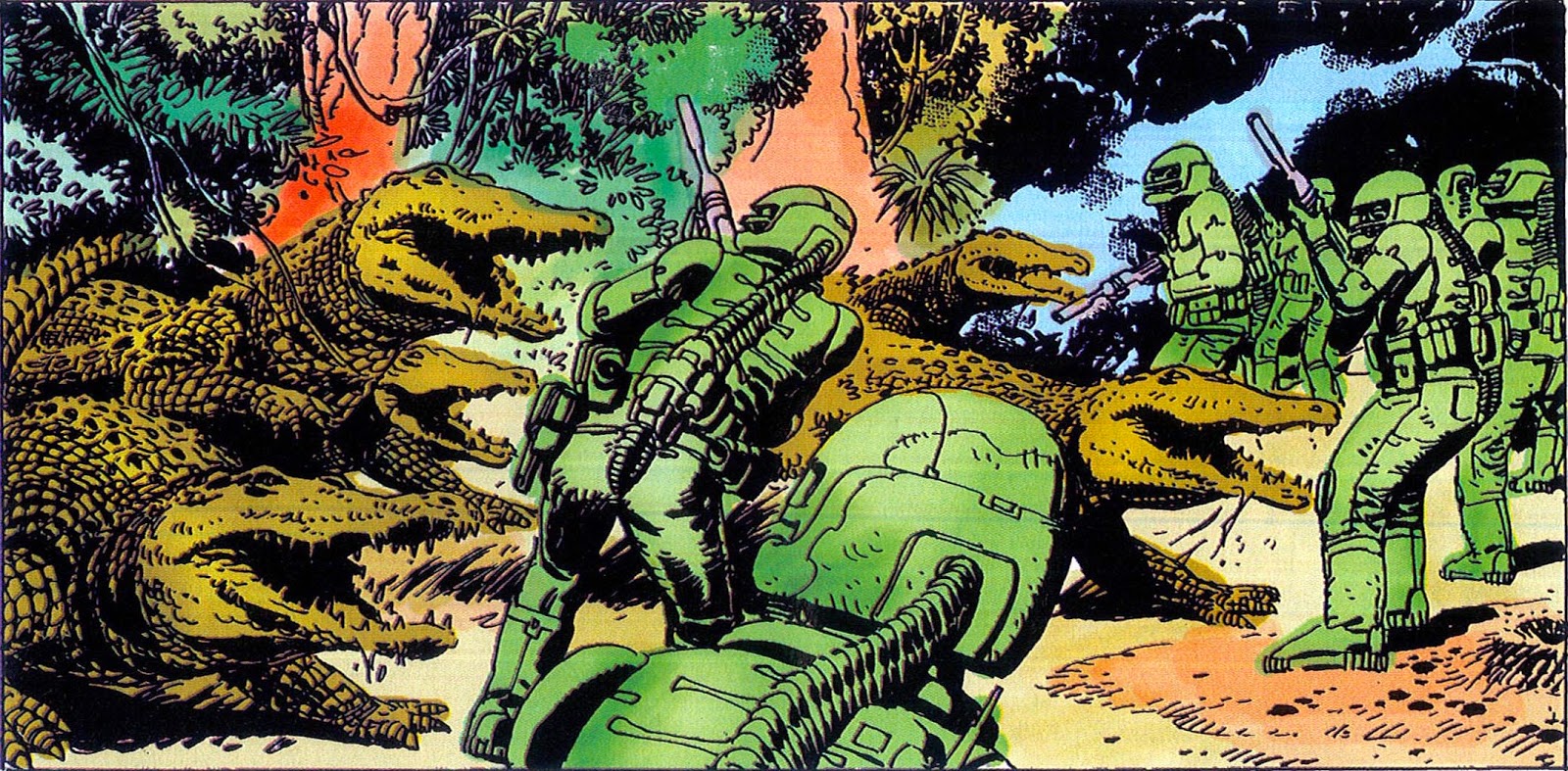 A well-equipped team encounters a gestalt-mind organism composed of alligators in the Southern swamplands.