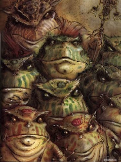 There are multiple species of the froglike humanoid Slaad existing in state of mutual hostility with each other and apparently every other sapient being. The Red are near bestial, the Blue are barbaric and more organized, while the somewhat more intelligent Green are merely narcissistic and sociopathic. All known Slaad are all the more unpleasant due to their parasitic or infectious means of reproduction. Both the Blue and the Green have human slaves indoctrinated to believe being used in such a way allows they themselves to be reborn as more evolved Slaad.