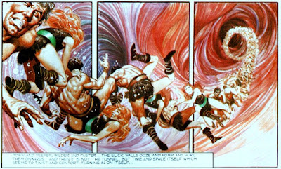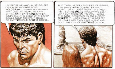 In the desert foothills of the Bahamas (the ocean waters had again seeped underground, or either last volume’s flood was very localized), Stom wrestles a deer-like creature to the ground, then he and Ember (Carrots in the last story) cook it over a fire. Storm again tells her about Jupiter’s Red Spot and his journey to the future. His story is met with incredulity by a man who has somehow managed to sneak up on them, riding what looks like a giant, crawling shrimp.