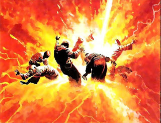 They drive the creature away, but the melee led to the collapse of the tunnel entrance. They have no choice but to go deeper into the cave where amazingly, they find a jungle valley.  After being chased by a reptilian monster, they make a raft. The current is strong and they are carried along not to a falls, but to a torrent of water streaming upward! They're carried up it and their raft is smashed on a ledge. From there, they pass through a tunnel and step out again into the snows--with the Azurian Chultu Monastery in sight.